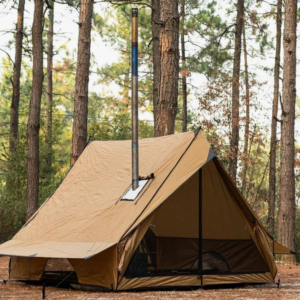 La tente avec poêle à bois, c’est un peu le chalet qu’on peut plier et trimballer dans son coffre. Conçue pour les vrais campeurs — ceux qui ne fuient pas à la première goutte de pluie — elle résiste aux rafales et garde la chaleur grâce à son tapis ignifugé et sa sortie prévue pour ton poêle. En gros, t’as ton salon au beau milieu des bois, sans devoir couper du bois à la main (enfin, presque).