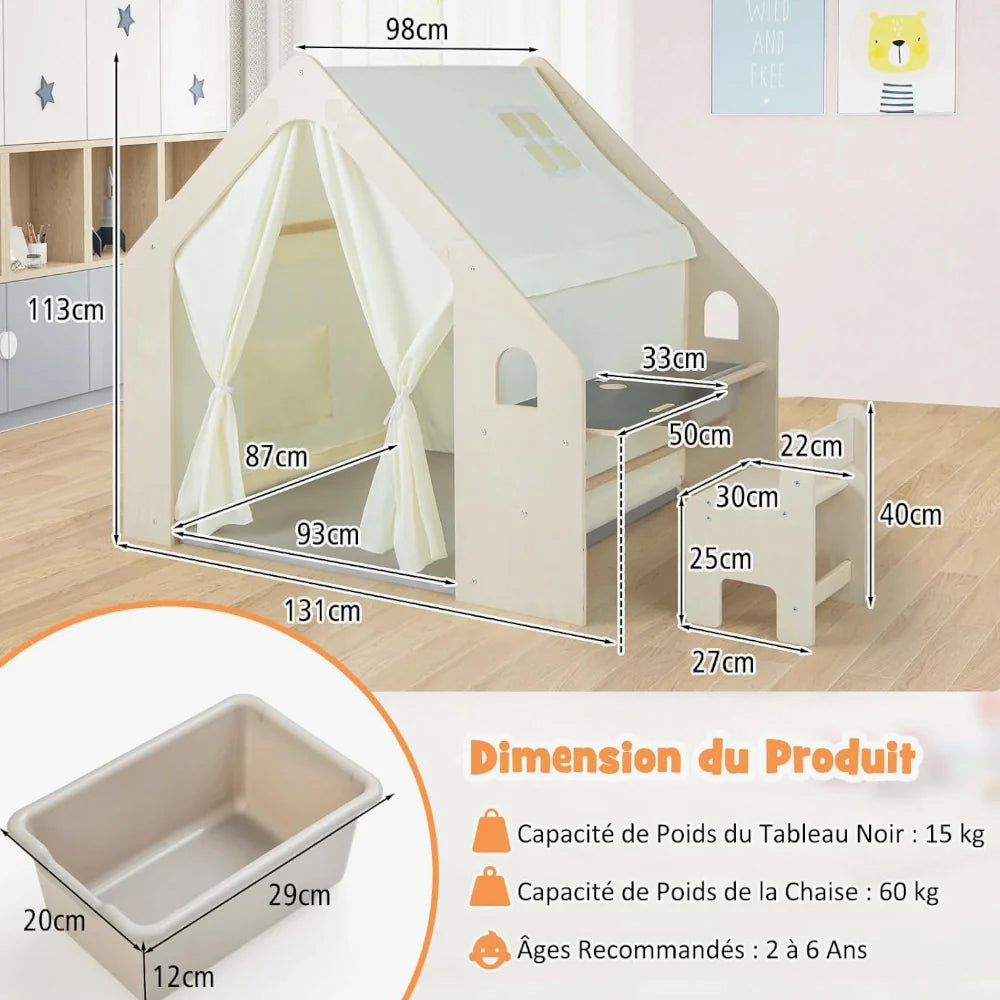 La tente bois, c’est un peu la maison de rêve miniature dont tout enfant a rêvé. Un petit coin douillet pour dessiner, inventer des histoires, ou simplement se cacher des parents (on sait tous que ça arrive 😄). Construite en bois robuste, elle tient debout même après plusieurs assauts de pirates ou de dinosaures imaginaires. Le tapis est doux, le tableau noir invite à gribouiller sans limite, et la petite chaise fait office de trône royal pour les chefs d’aventure.